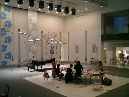 12/19設営風景。哲さんのブリキの魚が泳ぐ 黒い窓の中にさまざまな表情の雪の結晶を描いた左官の西井さん(左端) スチールの燭台を取りつける下尾さんと沢田さん(中央) 12/19
